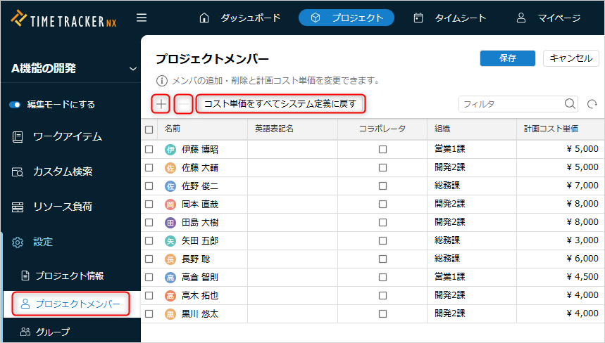 作成したプロジェクトに対して以下を設定することで、各メンバーが入力する実績とプロジェクトのデータが紐付きます。