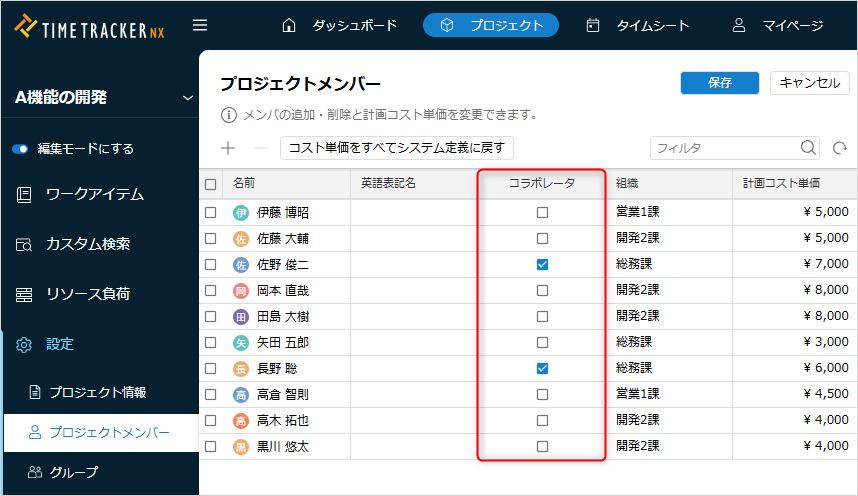 • コラボレータのメンバーは、タイムシートに対象プロジェクトのすべてのアイテムが表示されます。
