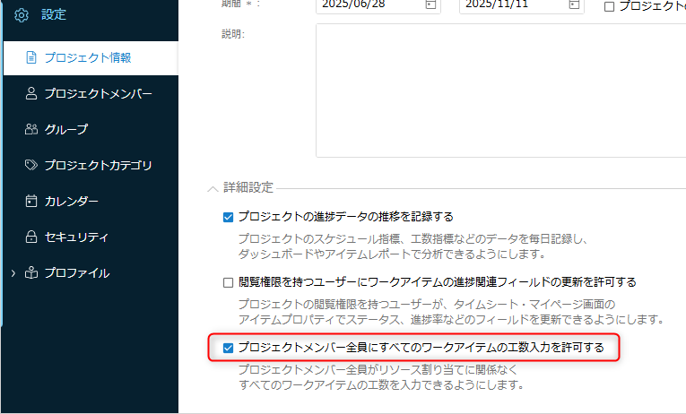 プロジェクトメンバー全員にすべてのワークアイテムの工数入力を許可する工数入力