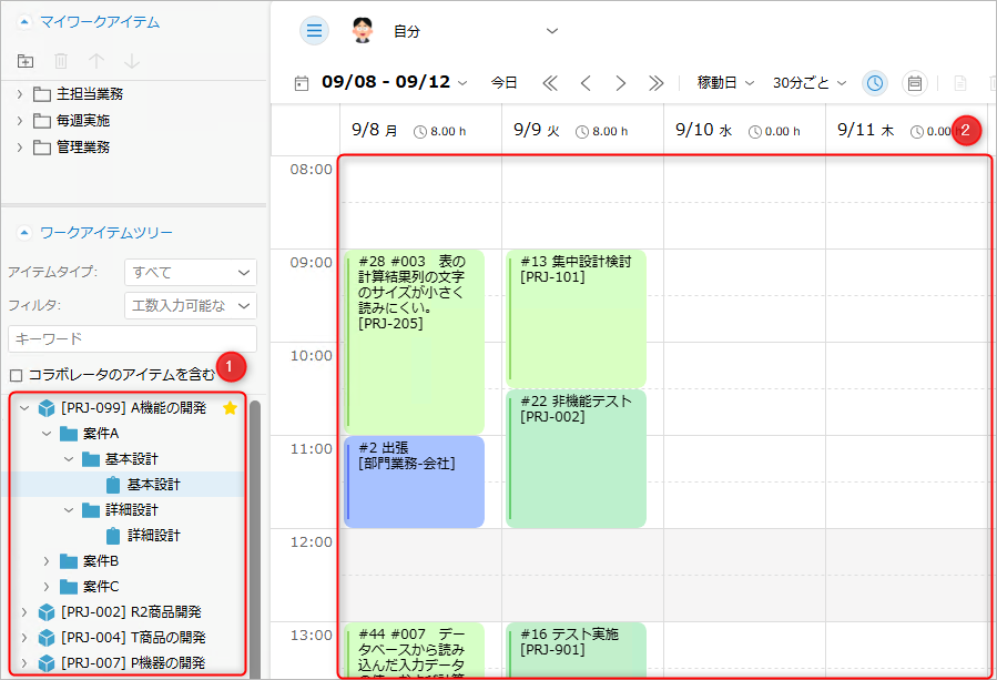 2. 選択したアイテムを、「工数入力ペイン」の該当する時間帯にドラッグ&ドロップする。