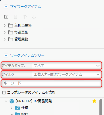 フィルタすることによりアイテムを探す手間が軽減され、工数入力の操作が簡単になります。