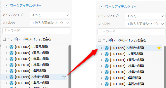 星アイコンが有効の状態になり、ワークアイテムツリーの上位に表示されます。