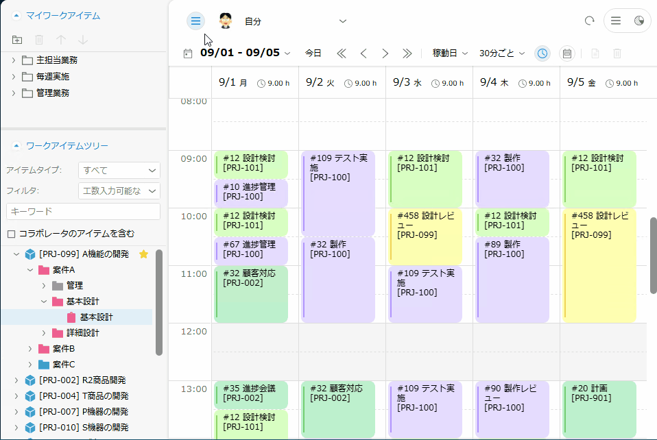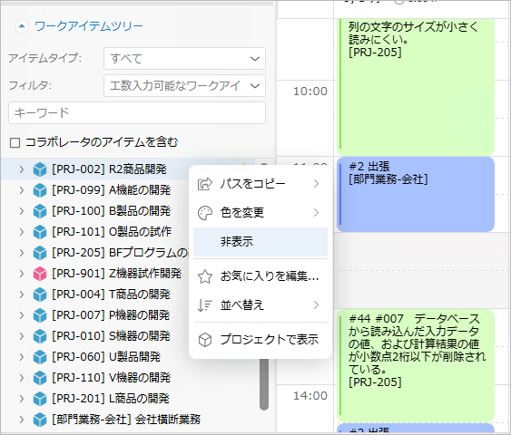 実績入力において使用しないプロジェクトは、ワークアイテムツリー上で非表示にすることができます。