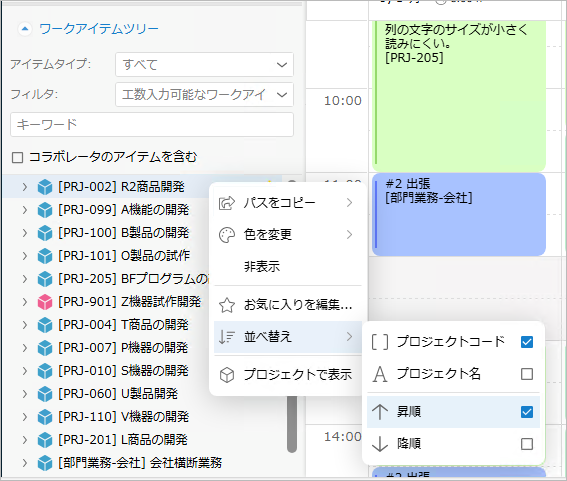 • プロジェクトコードもしくはプロジェクト名で、昇順か降順を設定できます。