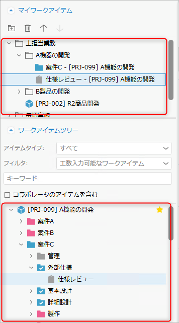「マイワークアイテム」に登録されたワークアイテムをダブルクリックすると、「ワークアイテムツリー」上で該当のアイテムが選択状態になります。