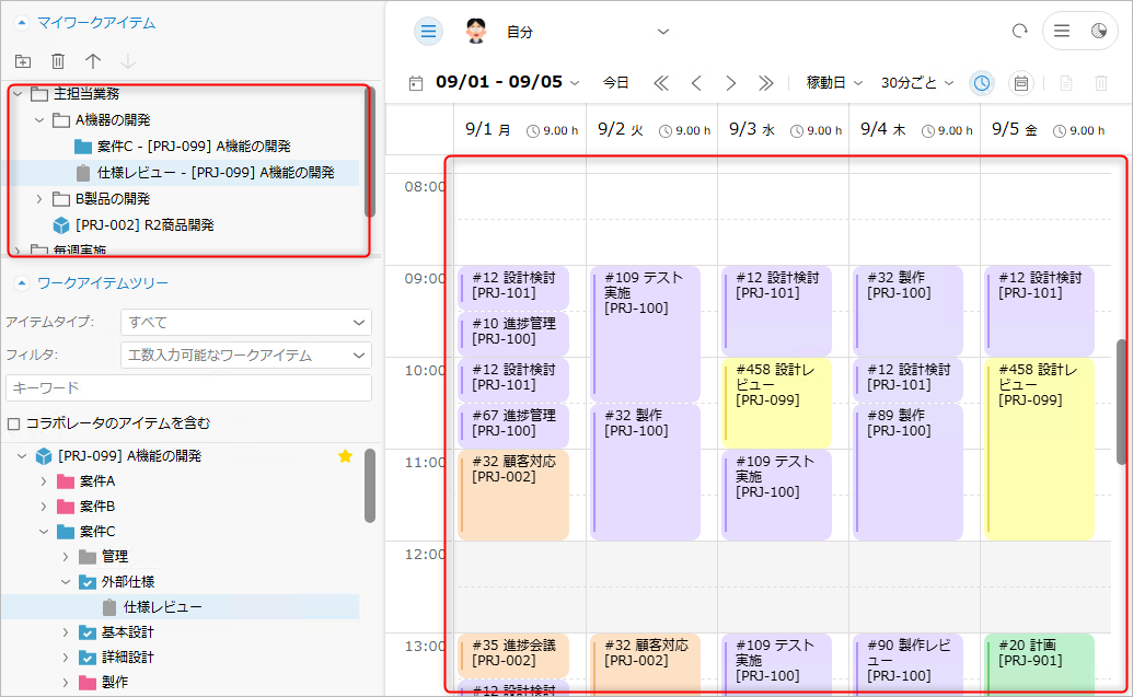 「ワークアイテムツリー」に表示されるワークアイテムが多い場合、実績工数を入力する際に対象のアイテムを探す手間が増えます。