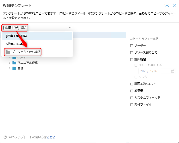 Select the project to be used as a template from the list in the "WBS template" dialog.