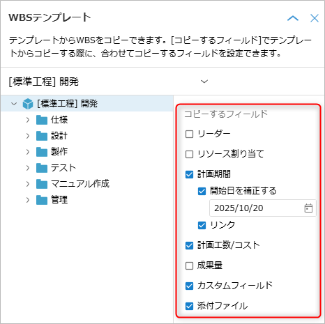 Select the fields you want to copy in the "WBS template" dialog.