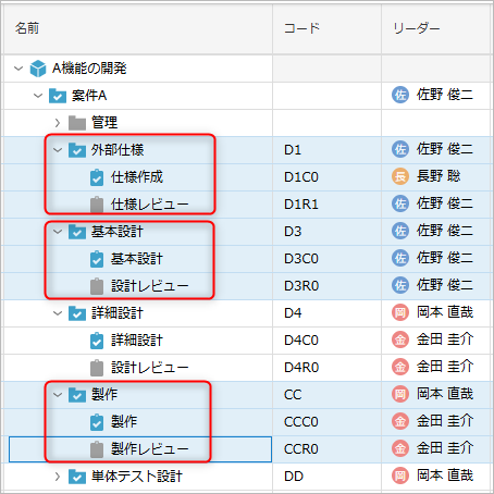 The above processing is performed for each selected range of work items. As shown in the figure below, processing is performed for each WBS unit (units within the red frames).