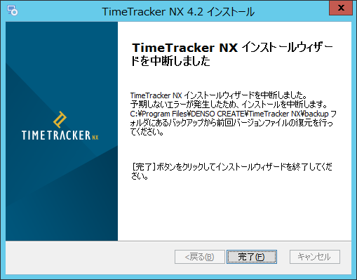 TimeTracker NX のインストーラを実行すると、以下の画面で止まり、インストールに失敗します。