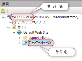 2. 画面左側に表示される[接続]にて、サーバー名・サイト名を確認する。
