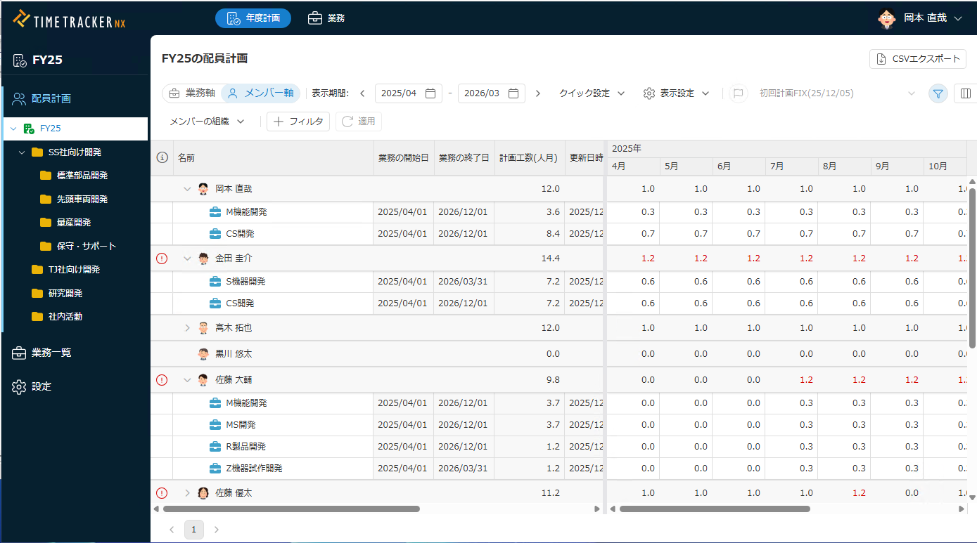 配員計画では、プロジェクト開始前にメンバーのアサイン状況を事前に計画し、確認することができます。