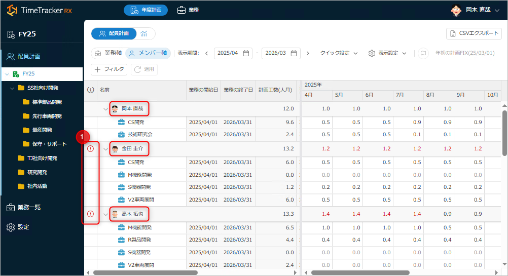 基準値(1.0人月/月)を超過しているメンバーは警告が出ます。(①)対象の業務に直接移動することもできます。
