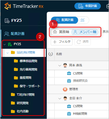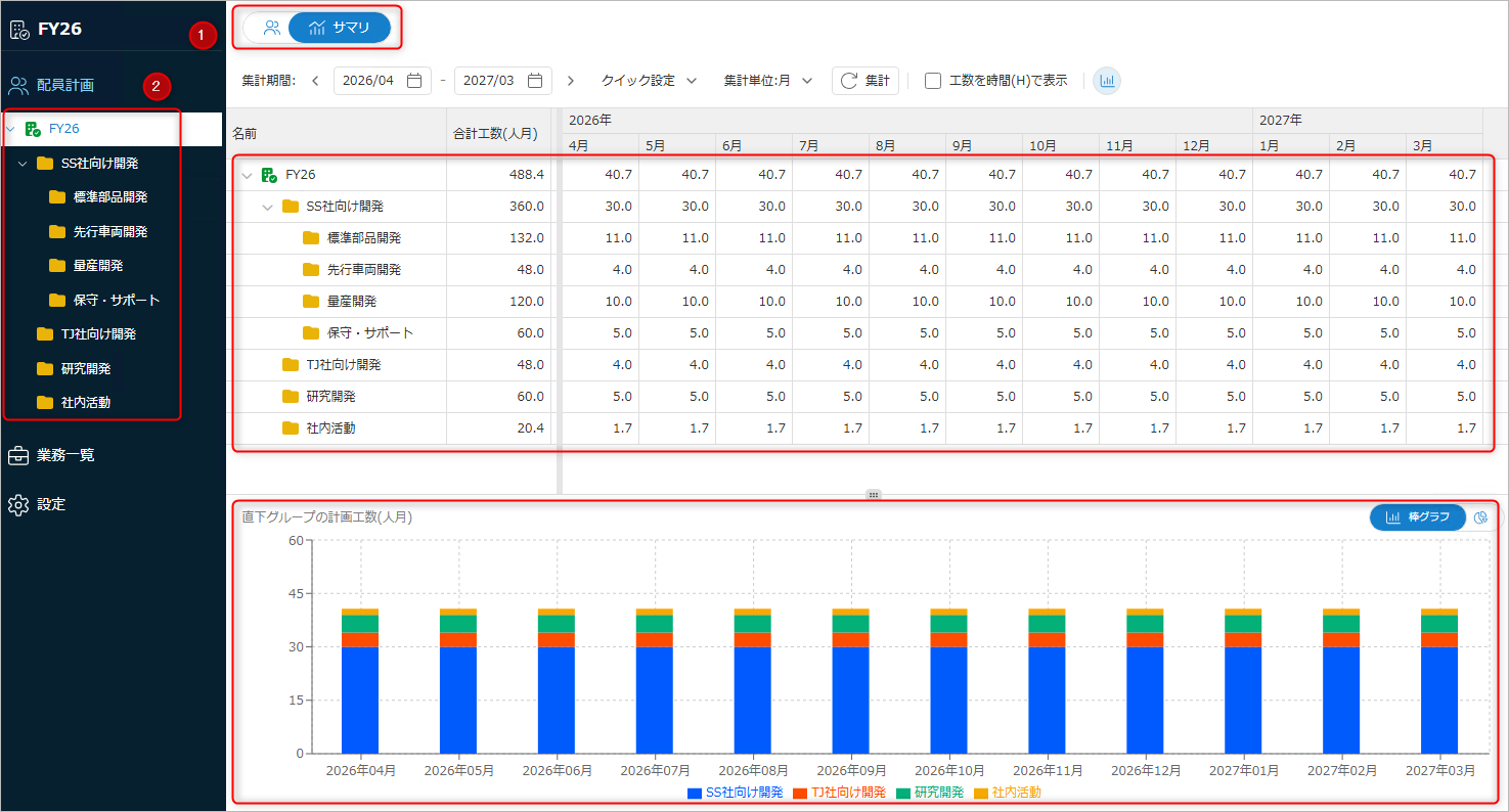 - ①:表示期間を切り替えます。年度計画の期間に合わせるなど、表示期間が簡単に設定できます。