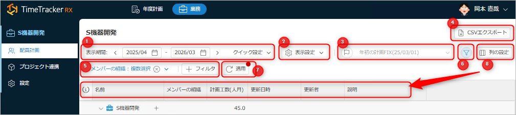 - ②:各メンバーの月ごとの計画を表示します。