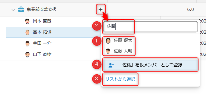 - ①:業務のメンバーの一覧を表示します。
