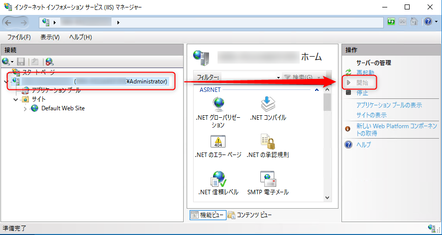 「開始」が選択できる状態の場合、IISが停止しています。