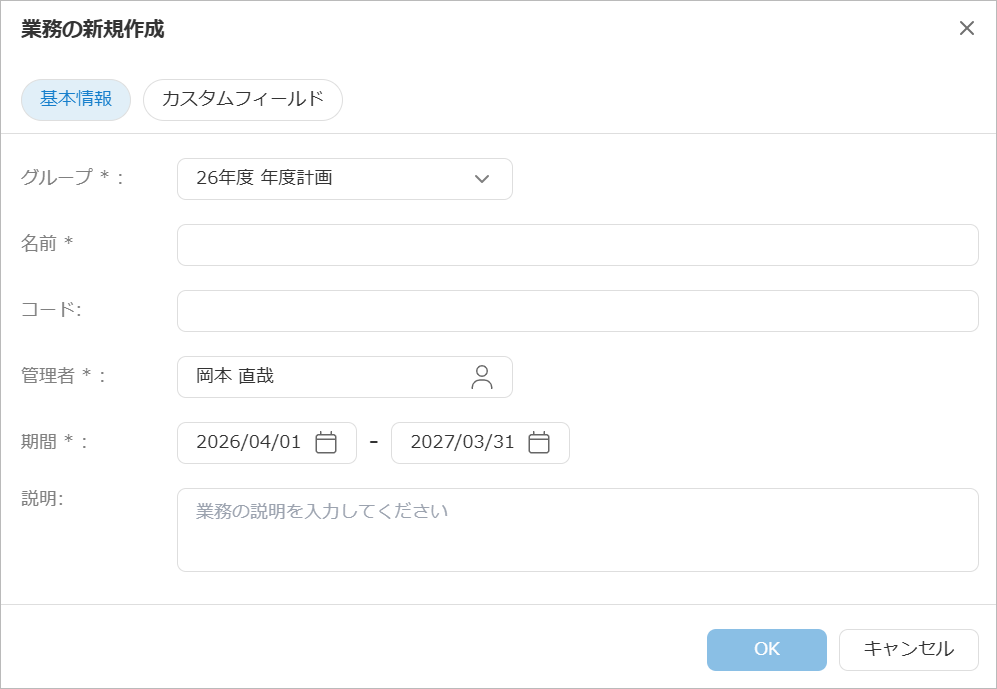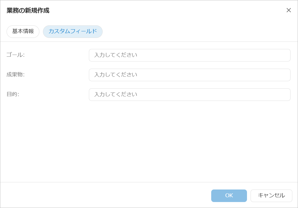 表示されるダイアログから、「基本情報」、「カスタムフィールド」を設定し、「OK」ボタンをクリックしてください。