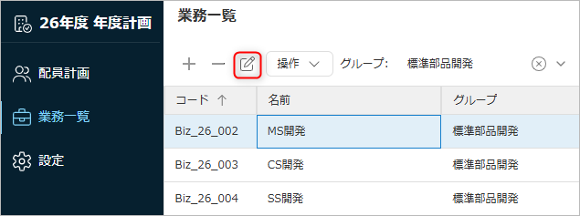 • 年度計画の業務一覧画面で、対象の業務を選択して「業務の編集」アイコンをクリックする