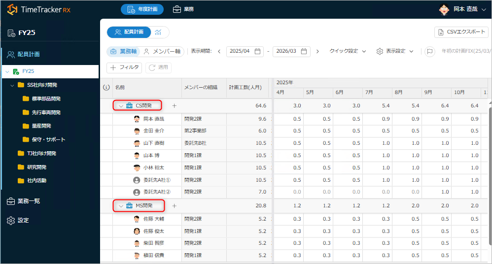 配員計画は、業務軸、メンバー軸で確認できます。