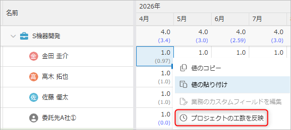 プロジェクト計画の計画工数や実績工数を配員計画に反映できます。