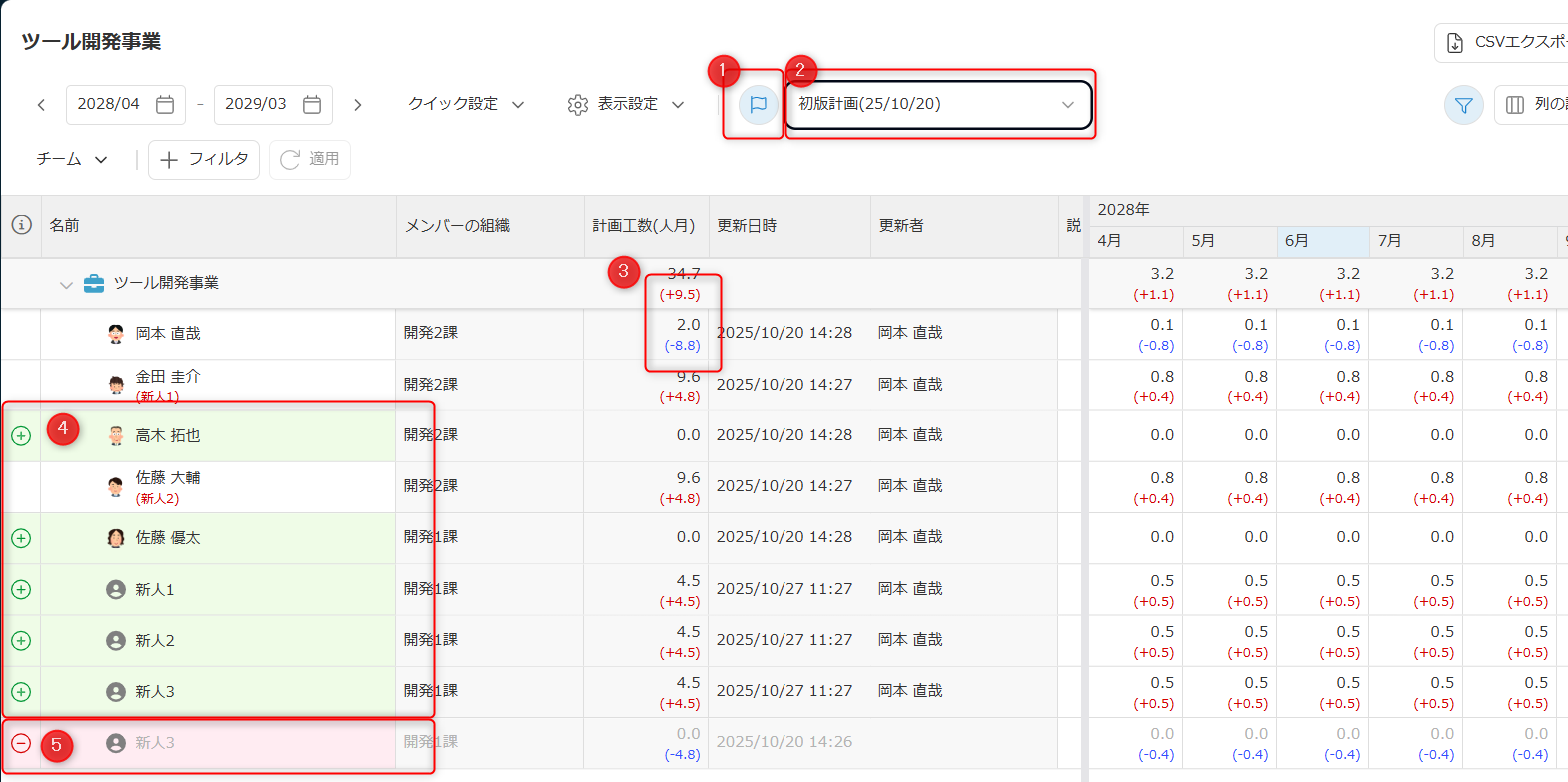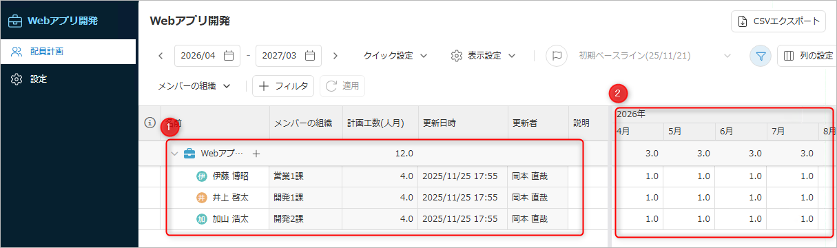 配員計画は、メンバーごとに各月の計画(人月/時間)を定義します。