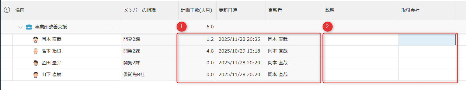 • ②:各メンバーの月ごとの計画を表示します。